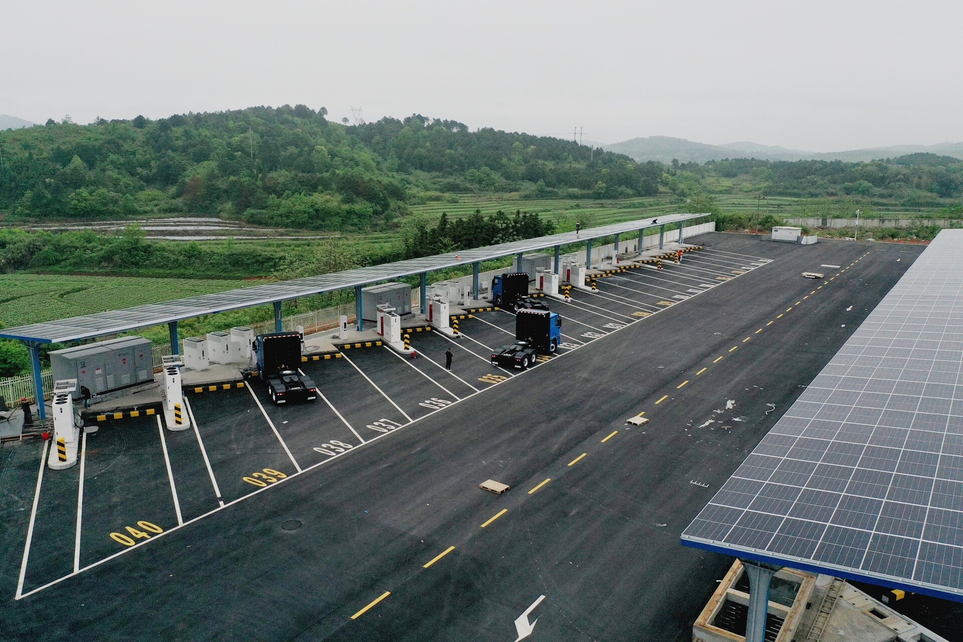 该项目采用“自发自用”模式,是一个集“超快充、光伏发电、大规模储能、智能微电网技术”于一体的综合性能源枢纽。配套建设光伏车棚分布式光伏项目及光伏系统储能柜,以及办公用房、维保车间等设施。