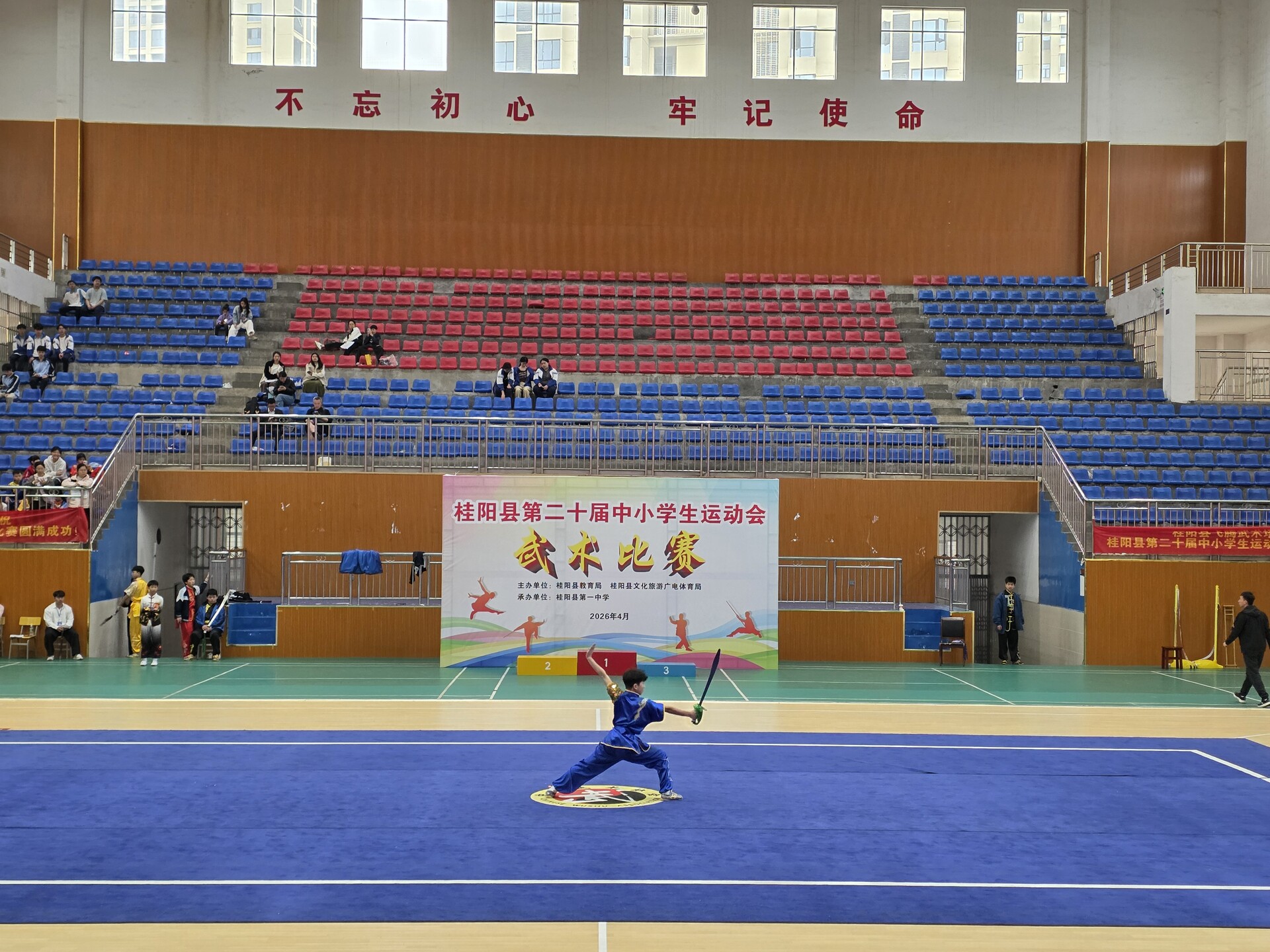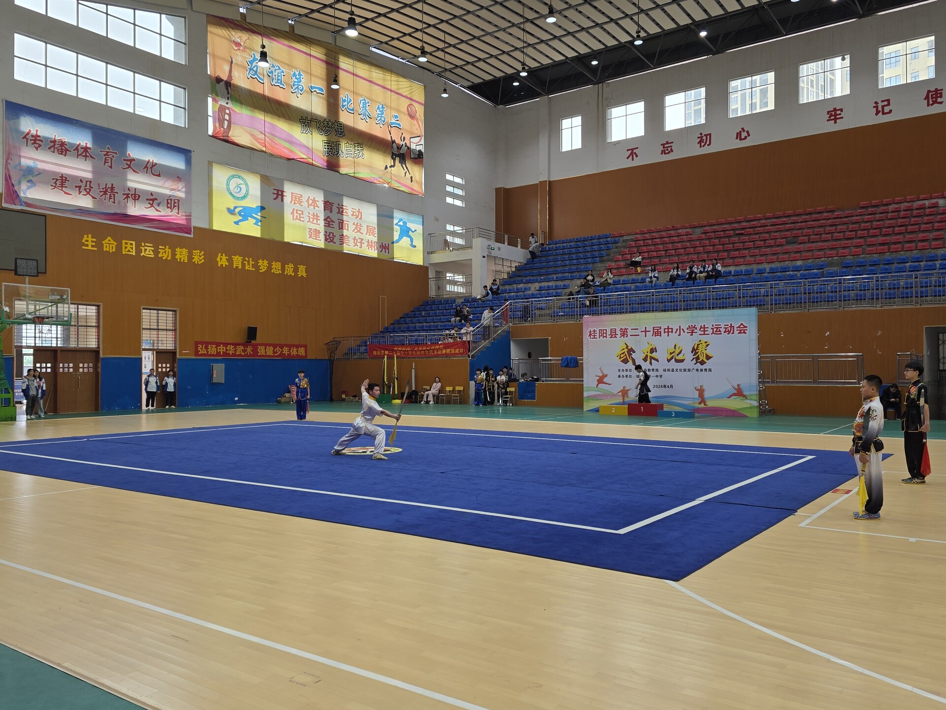 新桂阳4月20日讯(记者 李玮嘉)4月15日至17日,我县第二十届中小学生运动会武术比赛在桂阳一中举行。